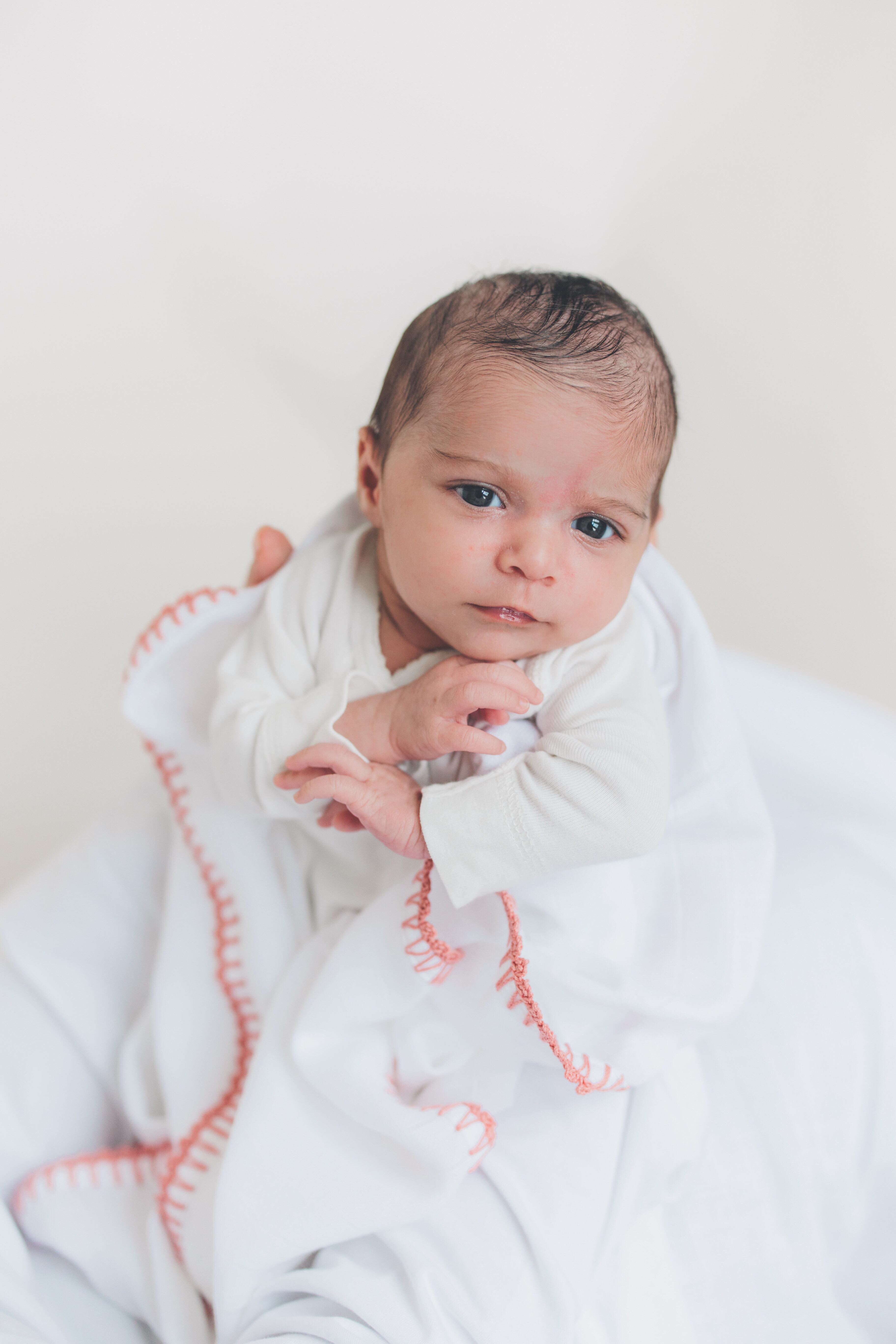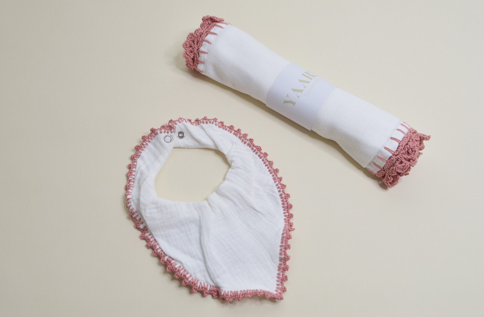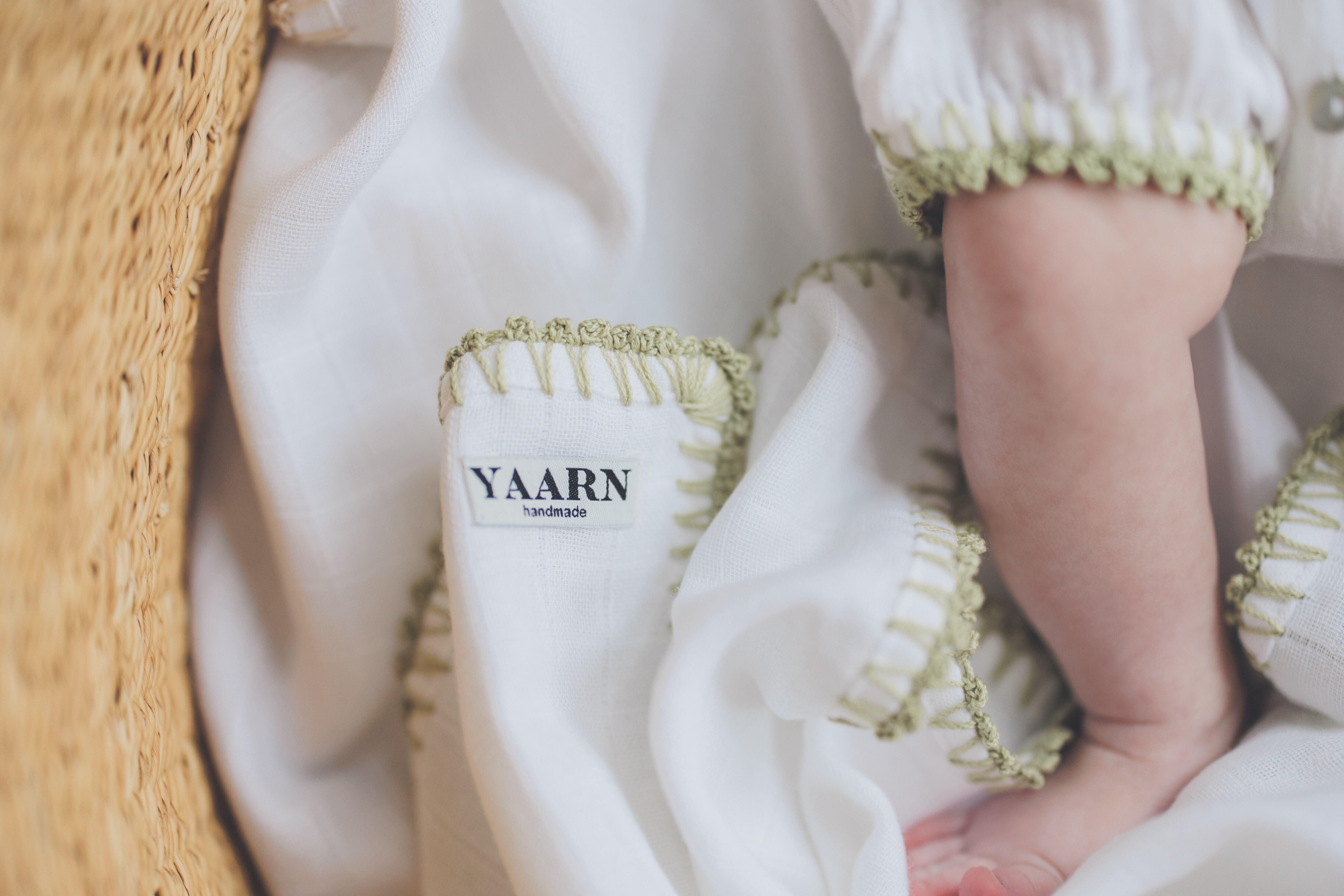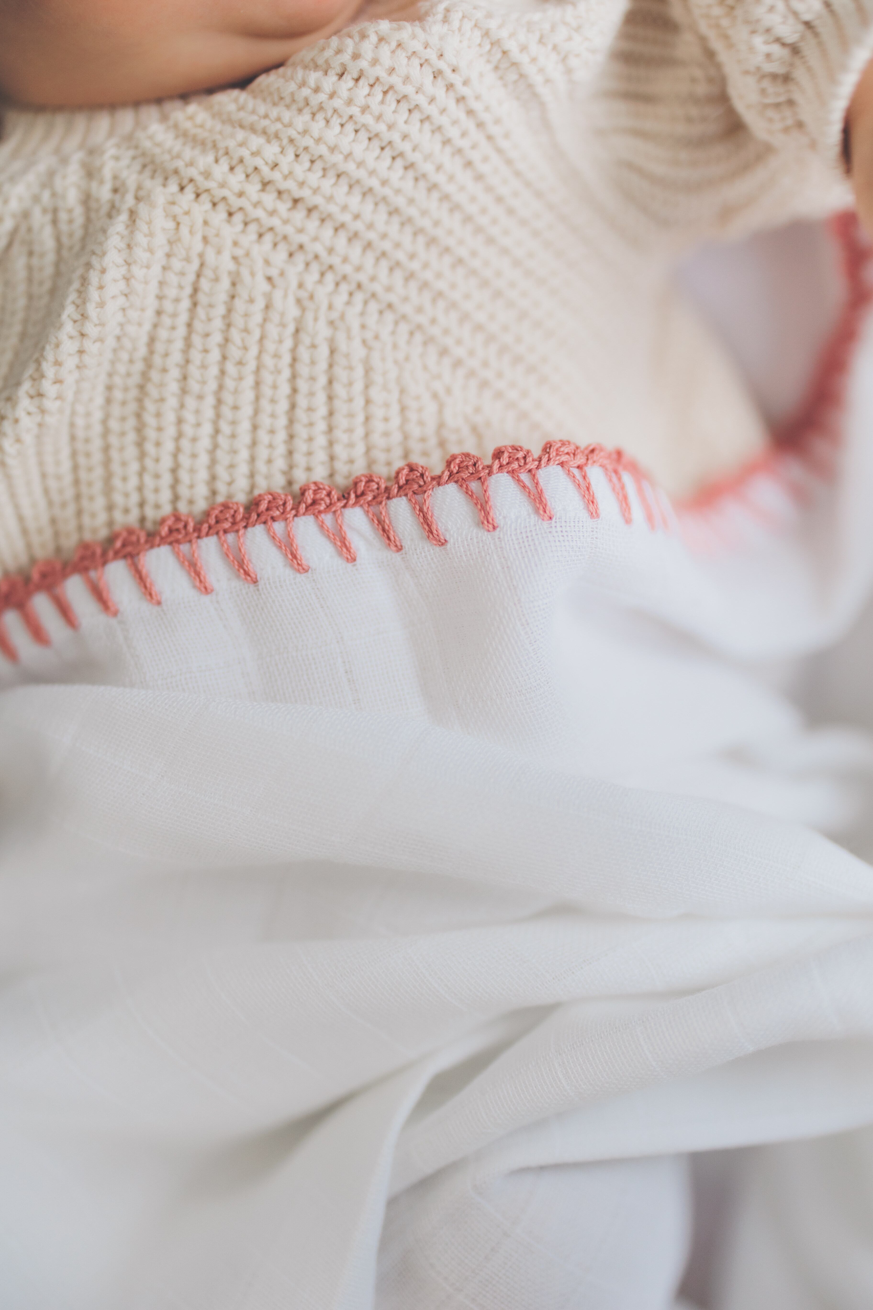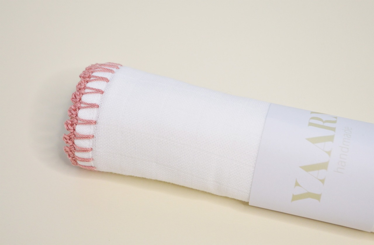 かぎ針編みの縁取りが美しいモスリンガーゼのおくるみ。