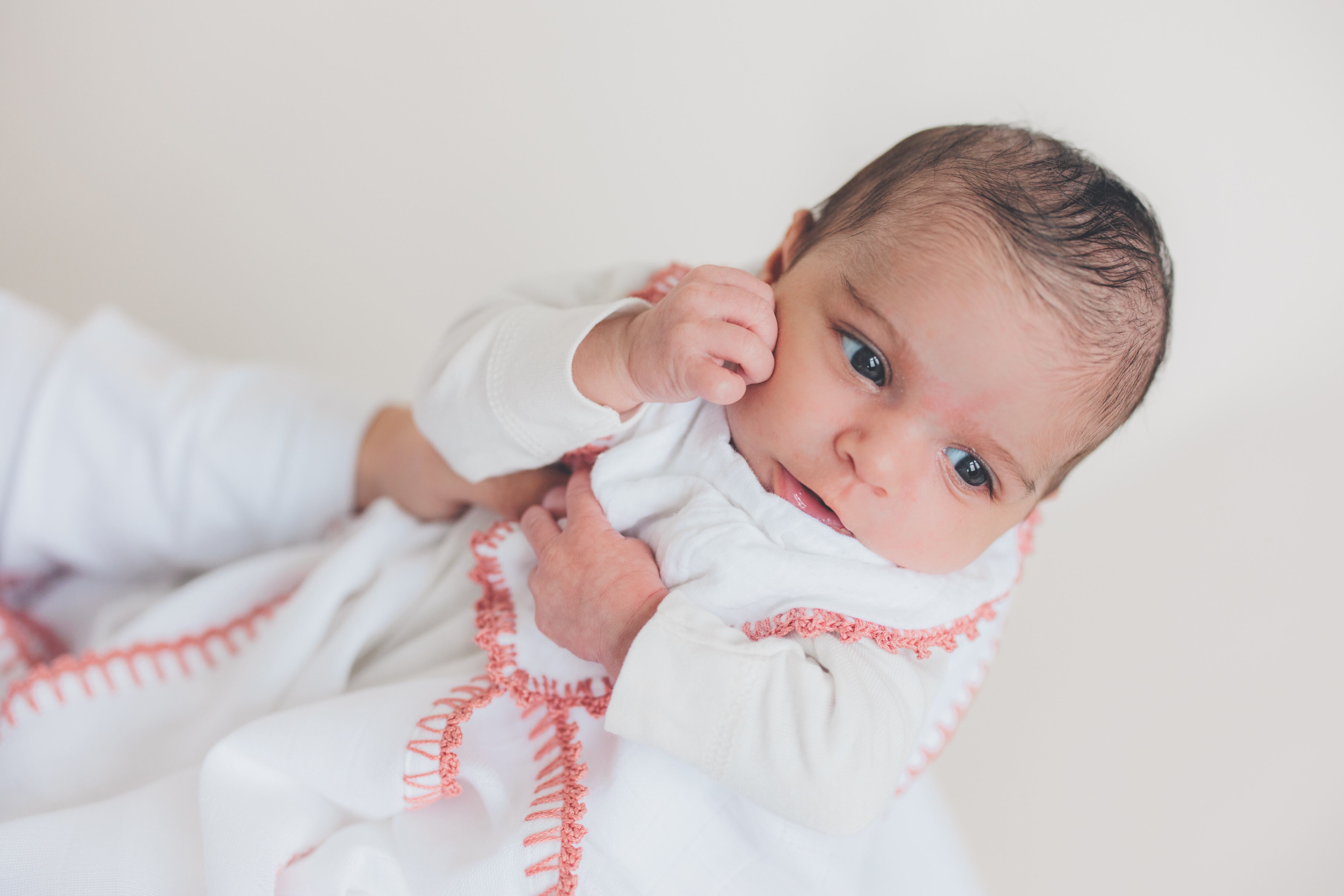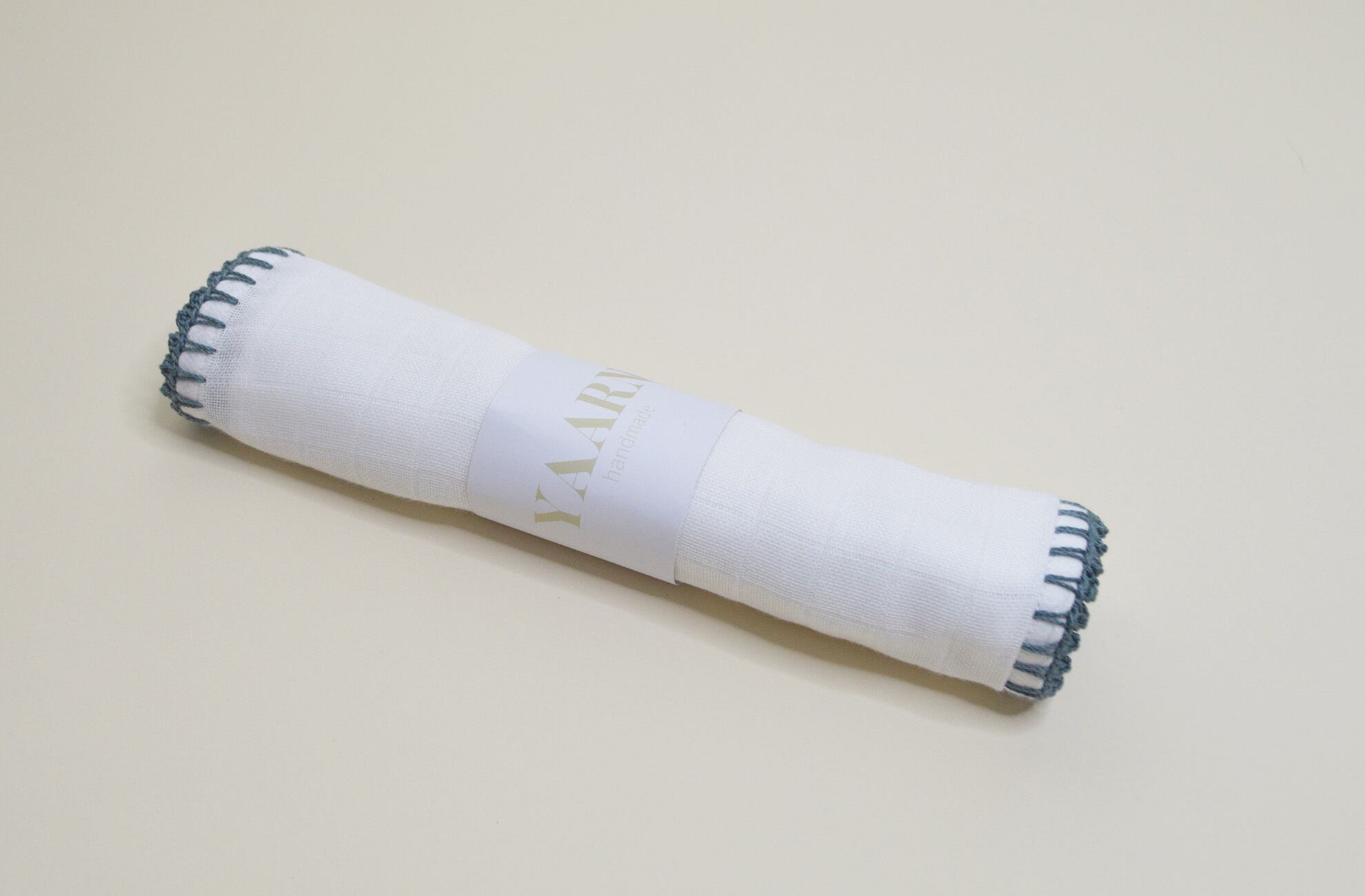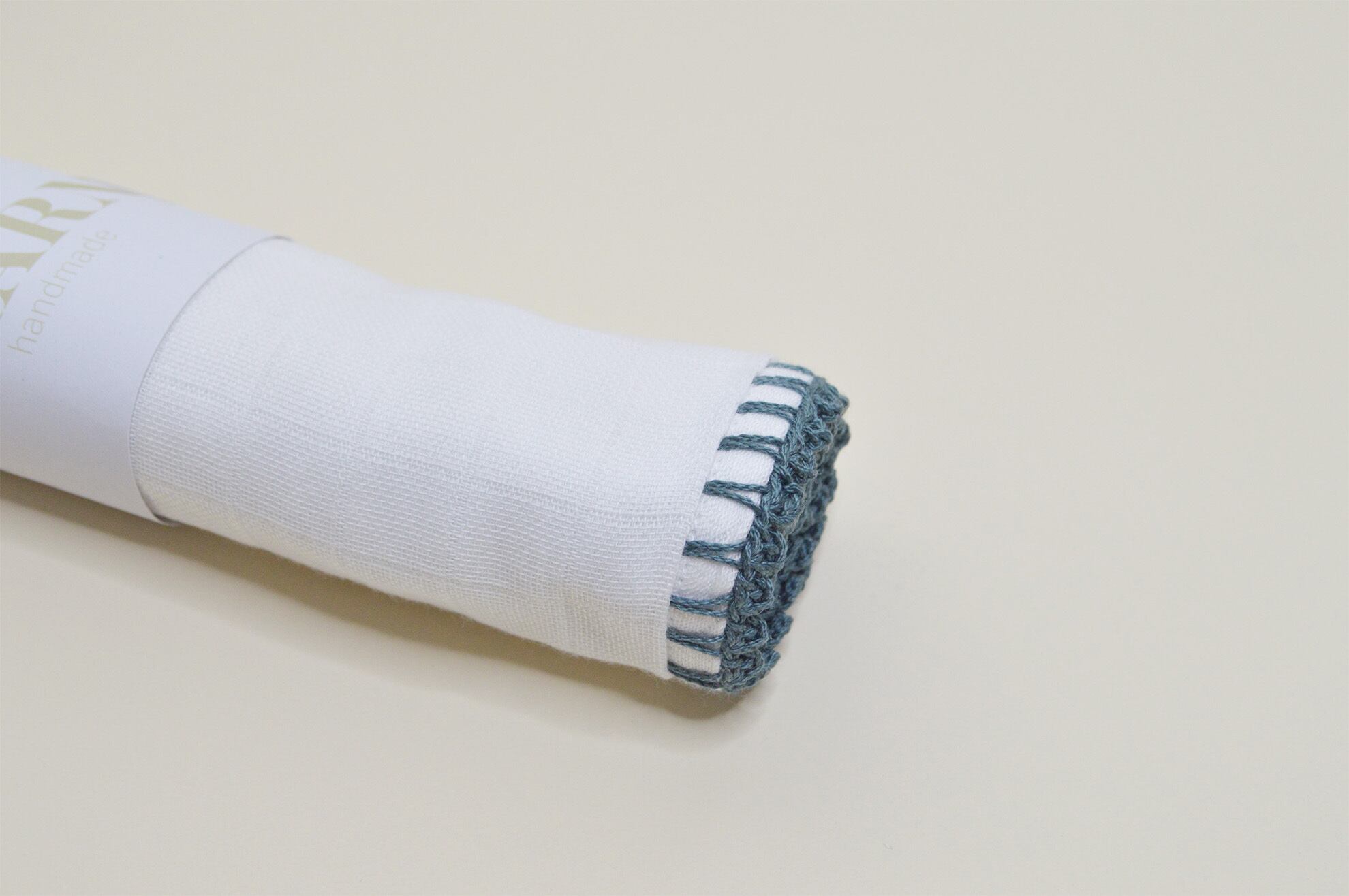 かぎ針編みの縁取りが美しいモスリンガーゼのおくるみ。