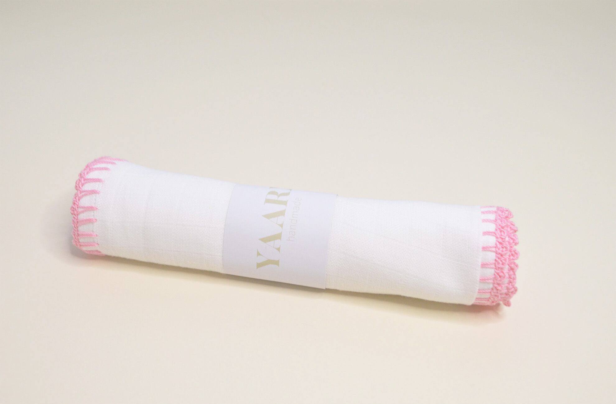 かぎ針編みの縁取りが美しいモスリンガーゼのおくるみ。