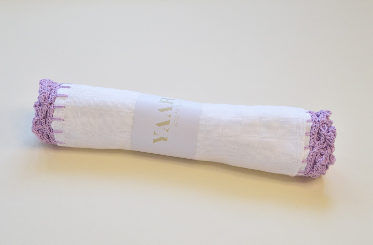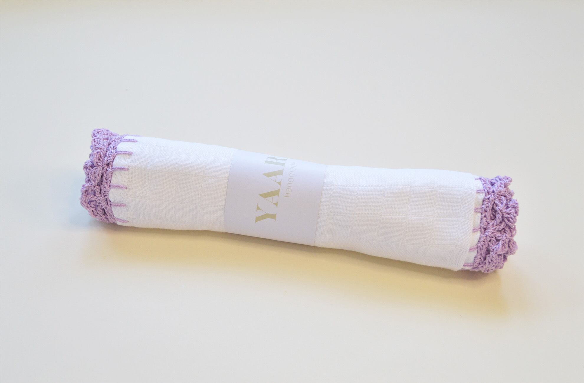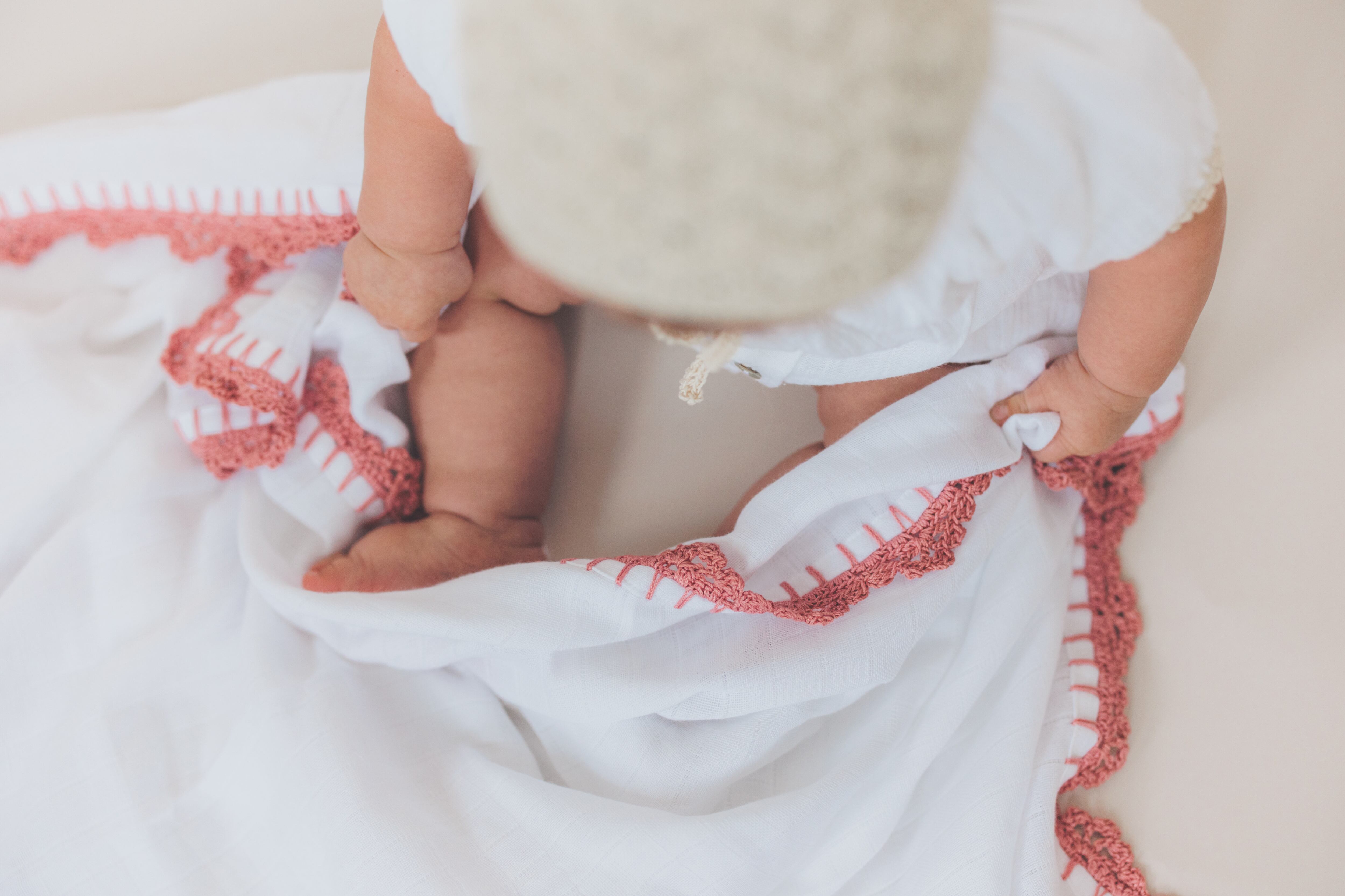 かぎ針編みの縁取りが美しいモスリンガーゼのおくるみ。