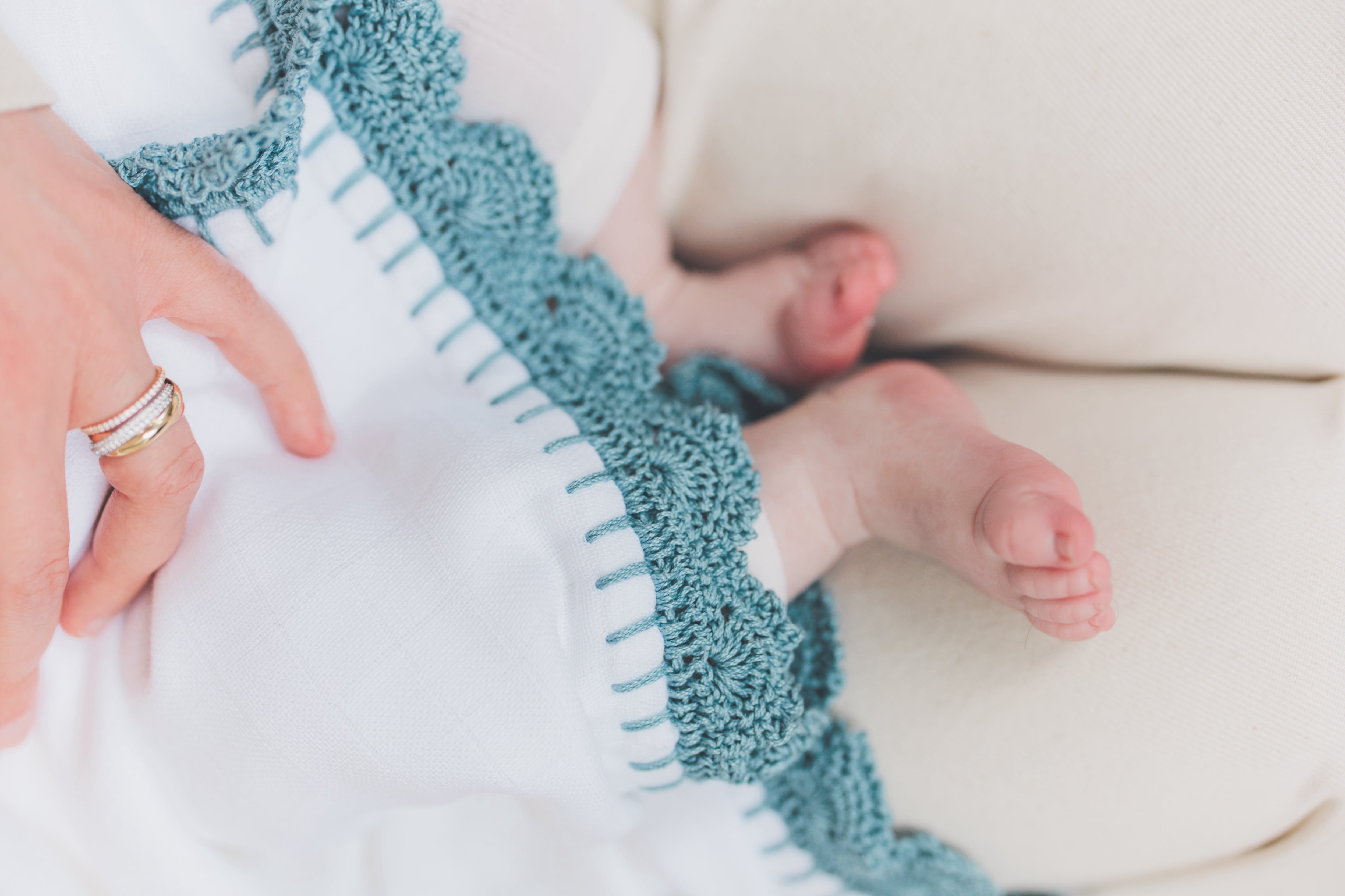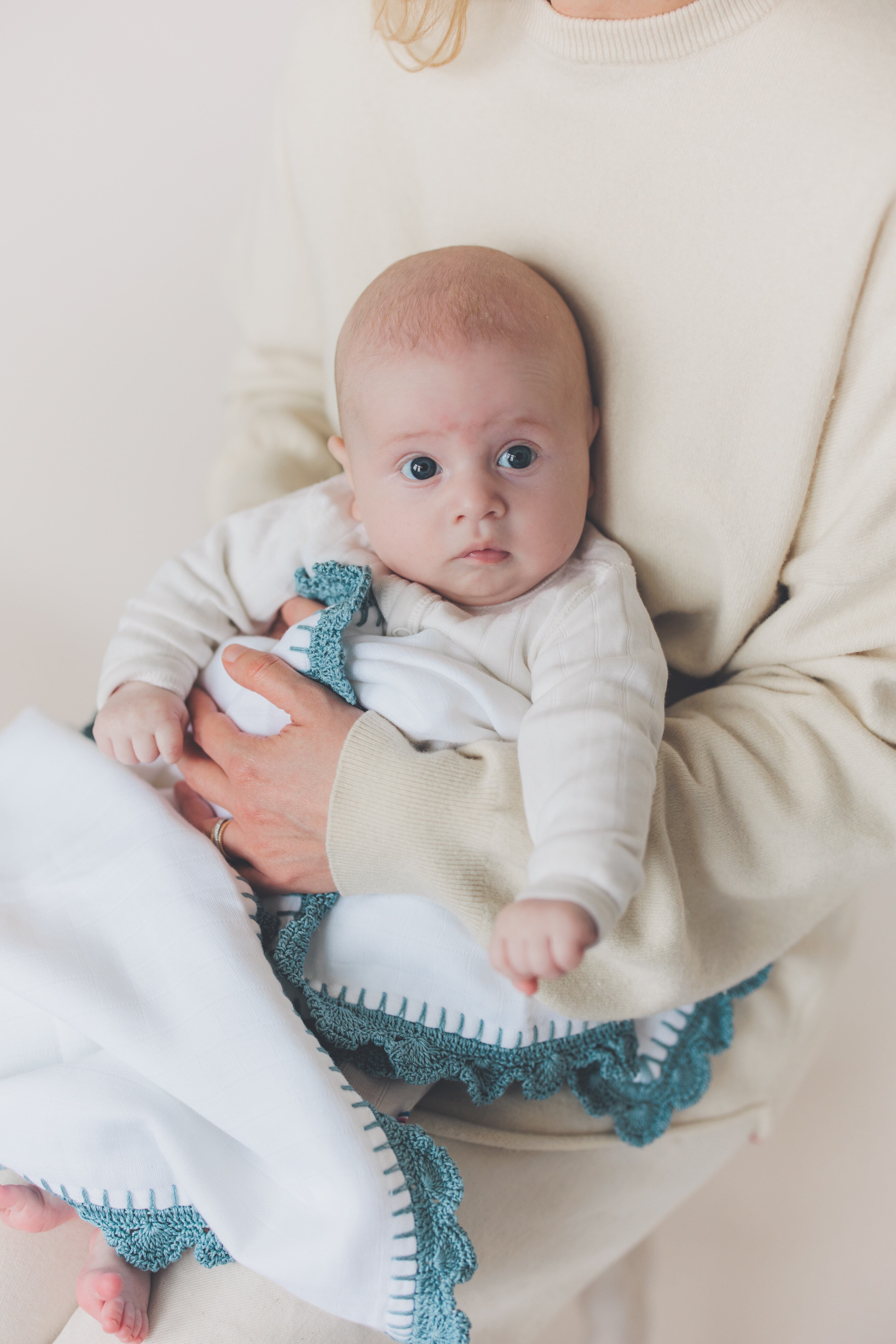 かぎ針編みの縁取りが美しいモスリンガーゼのブランケット。