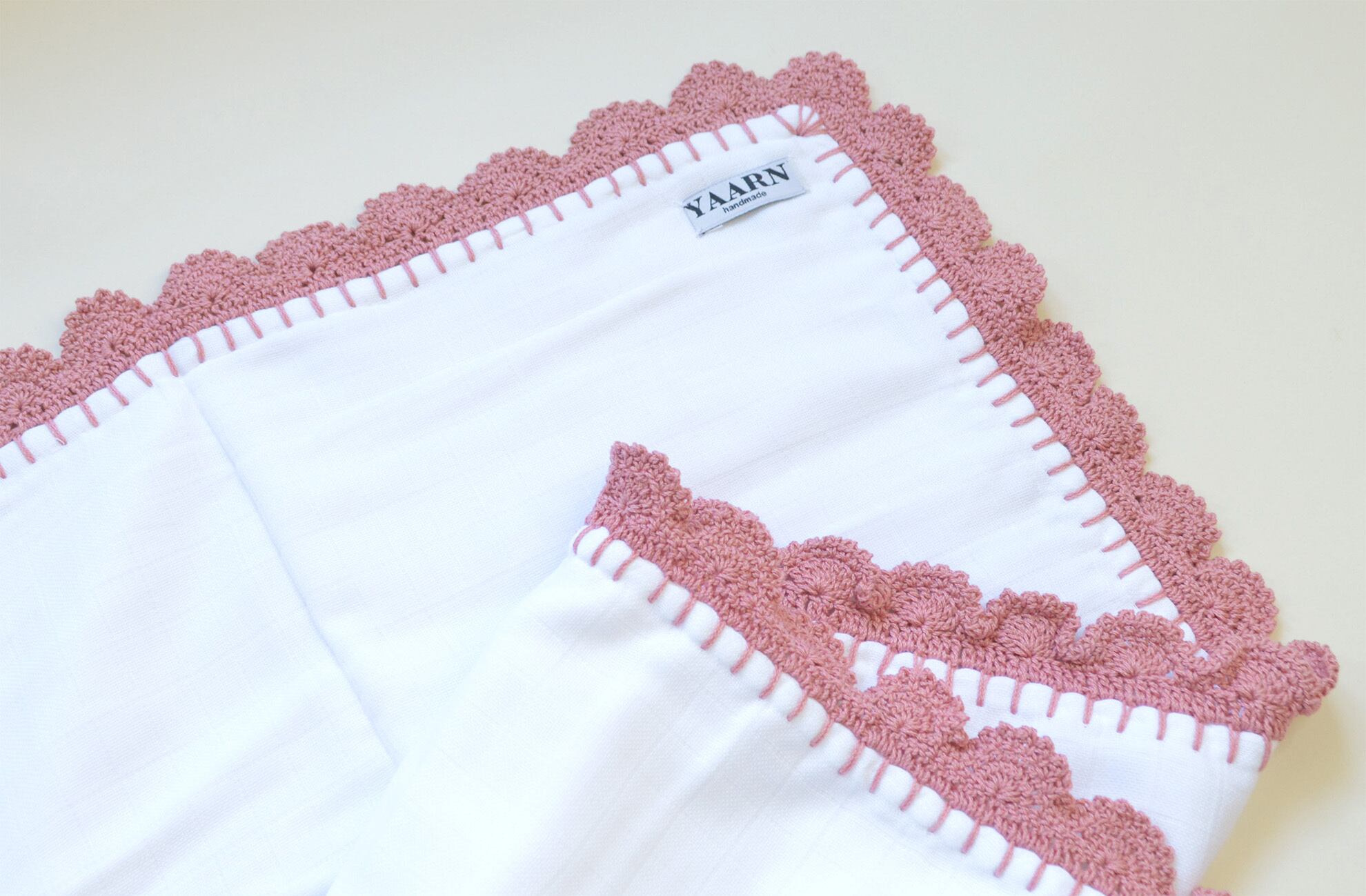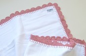 かぎ針編みの縁取りが美しいモスリンガーゼのブランケット。