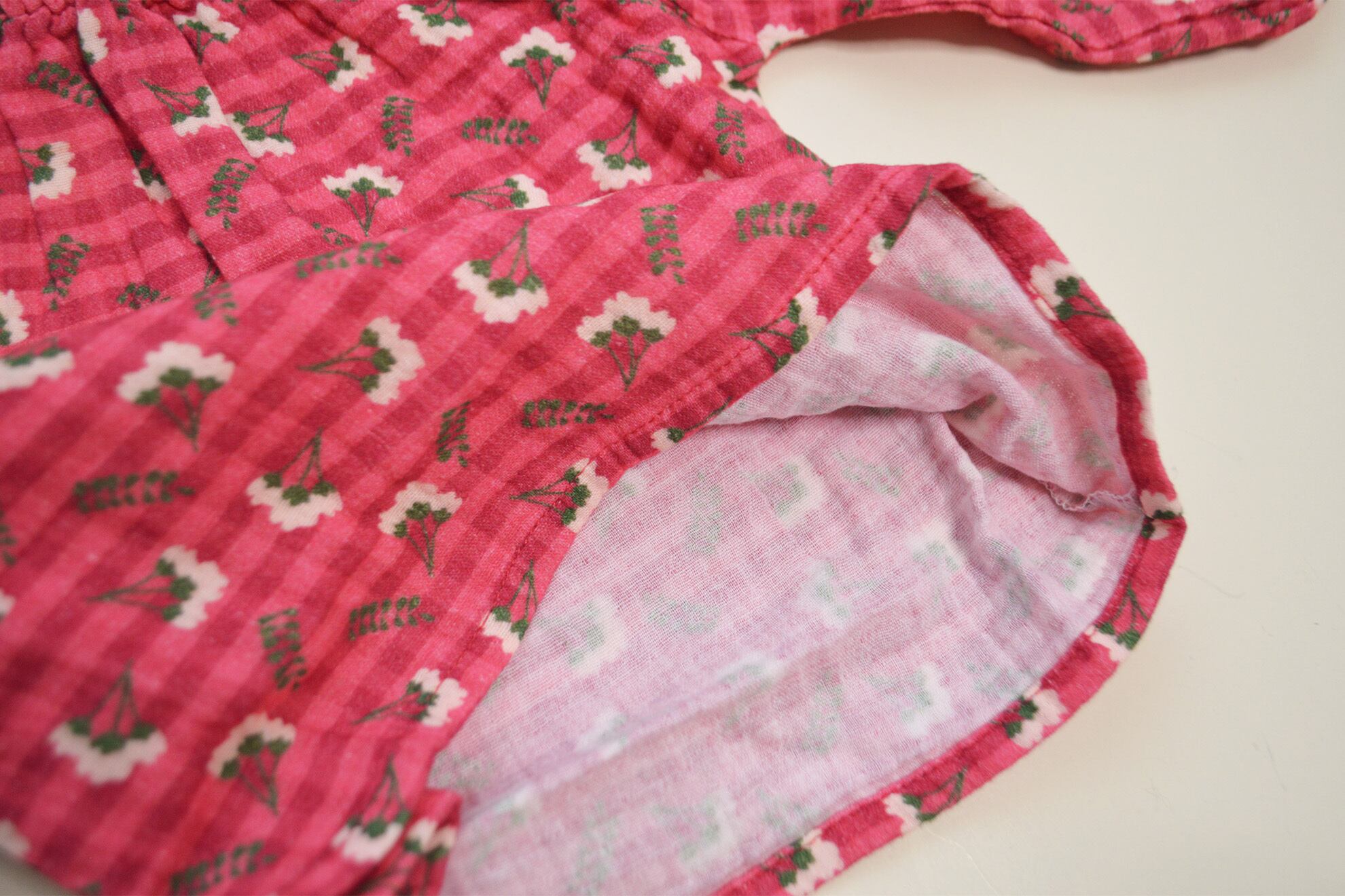 濃いめのピンクチェックを背景に花柄が散らばったプリントは組み合わせ次第で活躍します♪