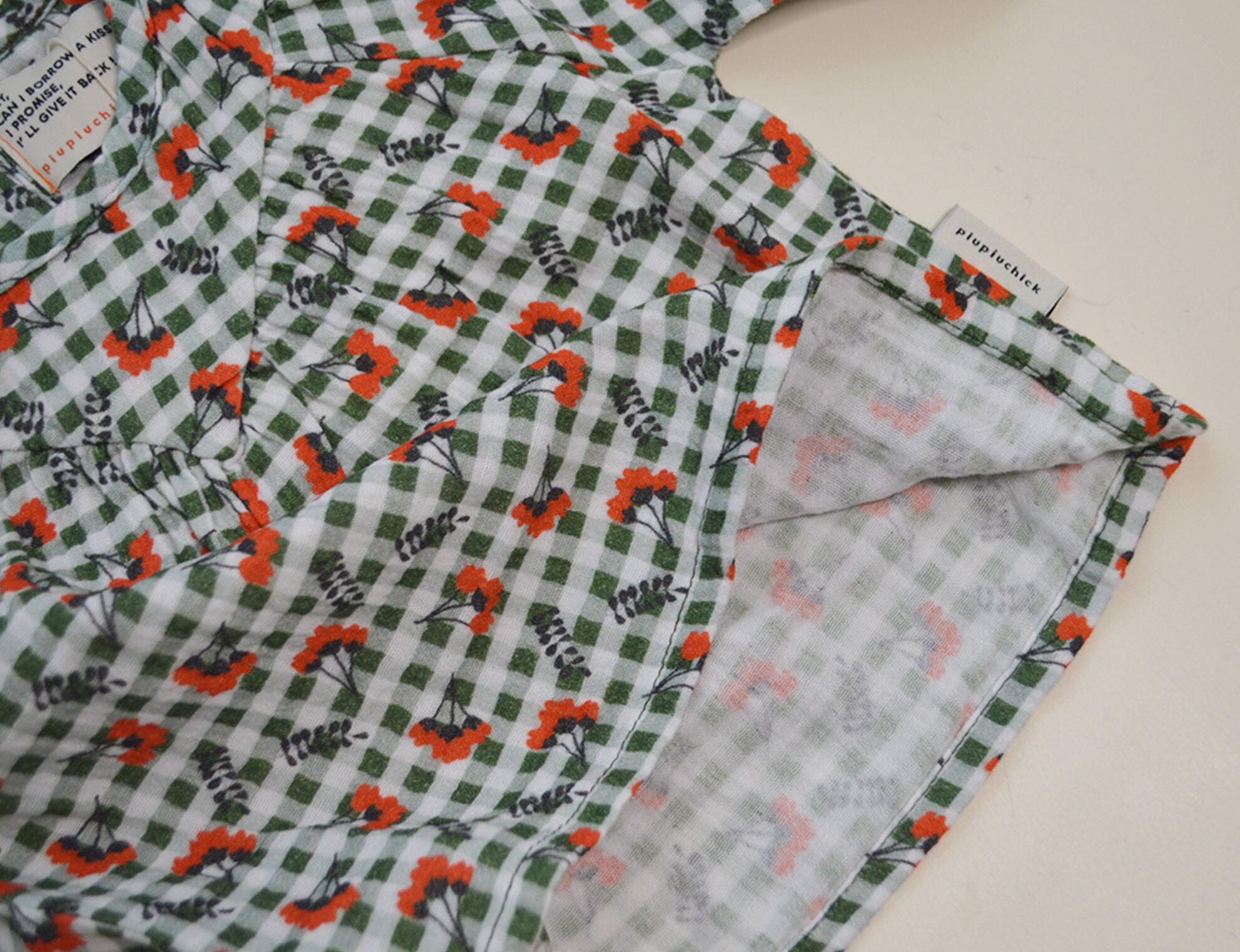 グリーンのチェックを背景に花柄が散らばったプリントは、組み合わせても楽しいレトロな色味。