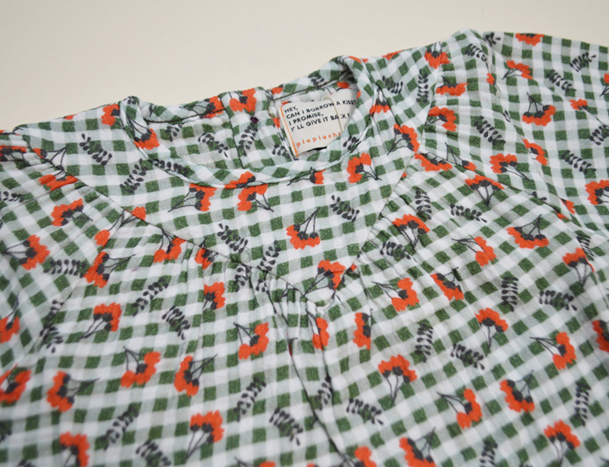 ・品名: blouse_ green checkered with flowers 長袖ブラウス・グリーンチェック&フラワー