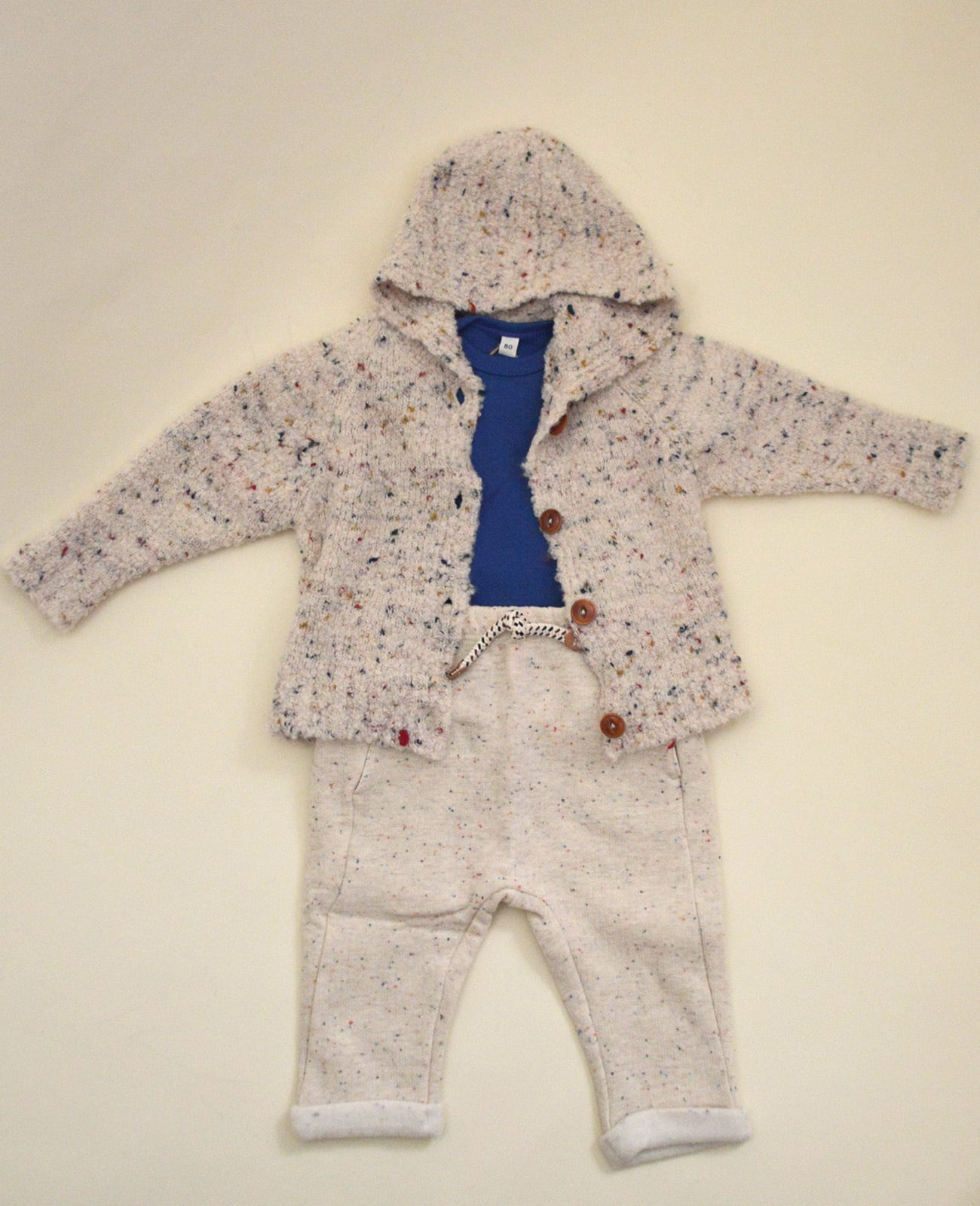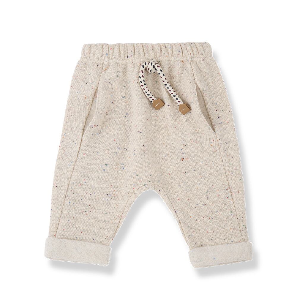 優しい印象の生成りカラーに散らばったカラフル糸が可愛い、ジェンダーレスなパンツ。