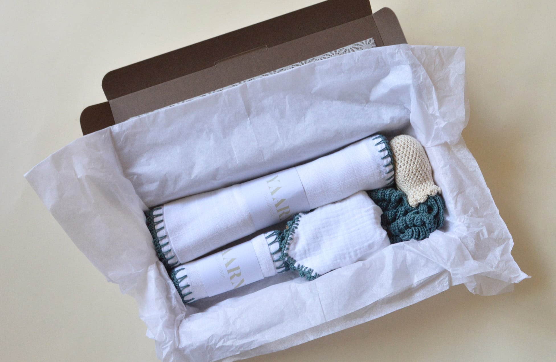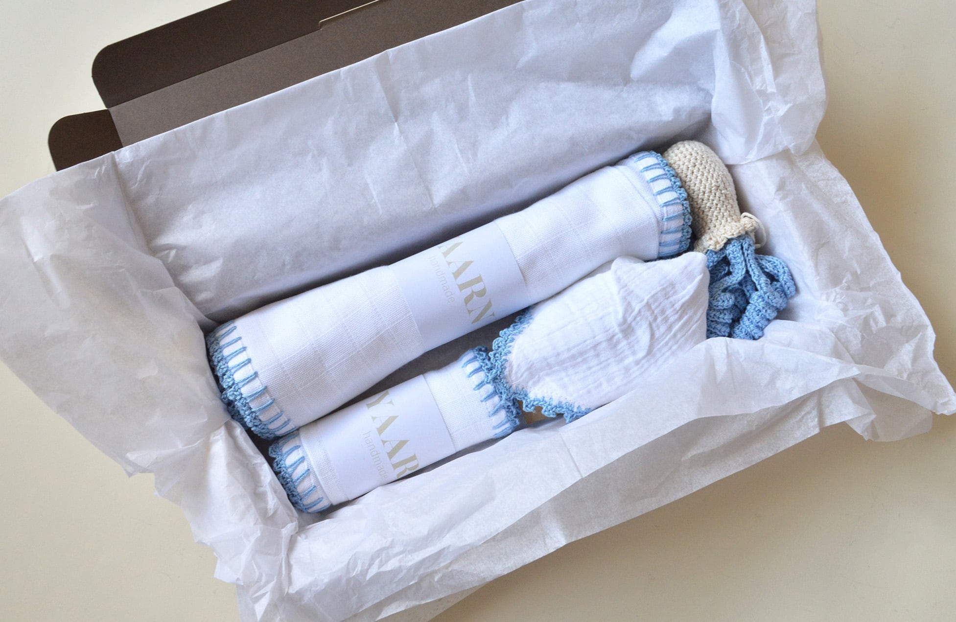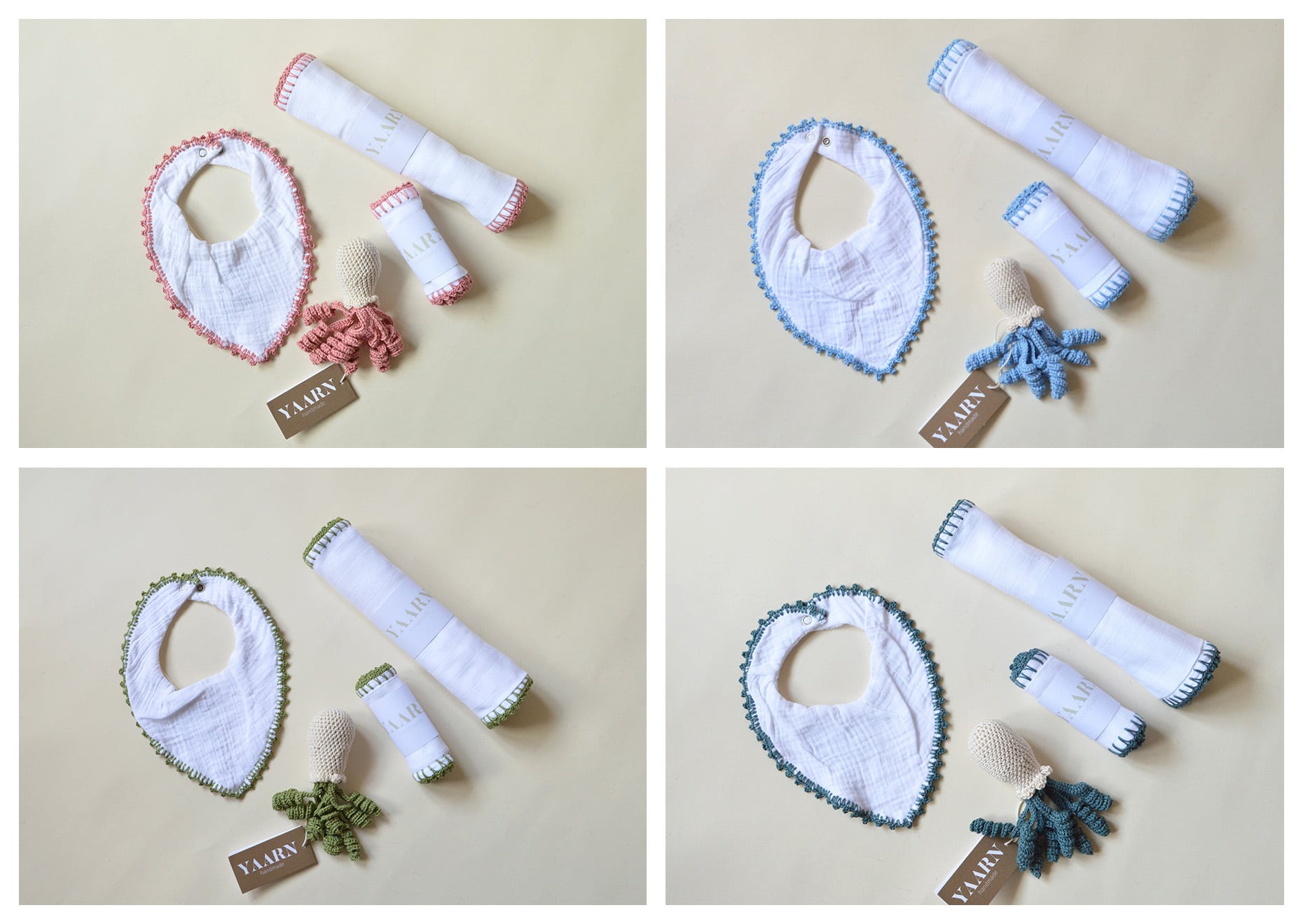 ハンカチサイズのモスリンスワドル。軽くて柔らかいモスリンコットンに、かぎ針編みの縁取りが施されています。洗濯にも耐久性があり洗う程に柔らかさを実感できます。赤ちゃんの日常的なお口拭きや、こぼしたものを拭き取るのに何枚あっても嬉しいプロダクト。
