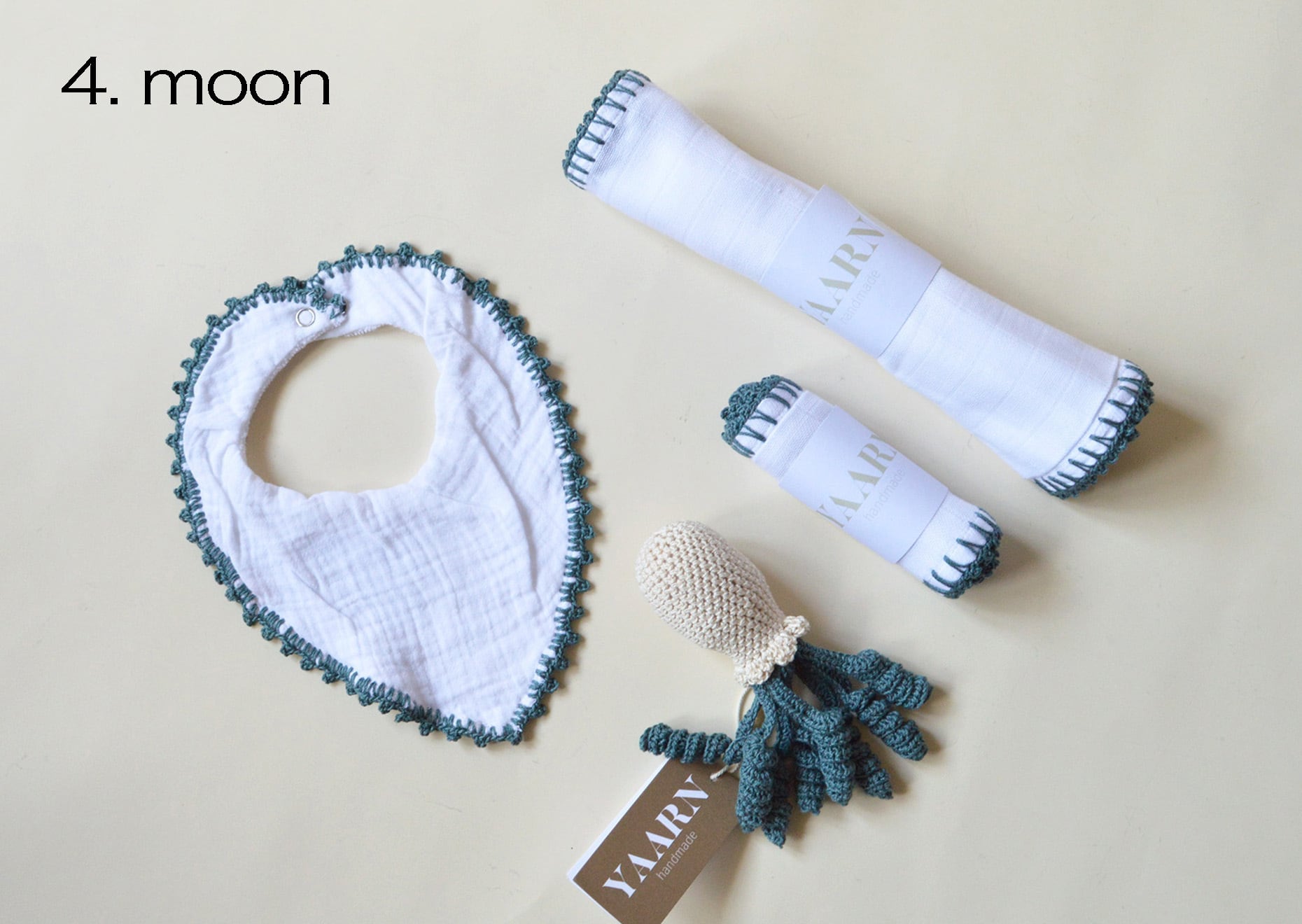 鍵編みの縁取りが美しいモスリン・スタイ。表面は柔らかくサラッとしたモスリンコットンに、内側はパイル地作りになっています。スナップボタンは二つついており、0〜1歳頃まで調整ができます。