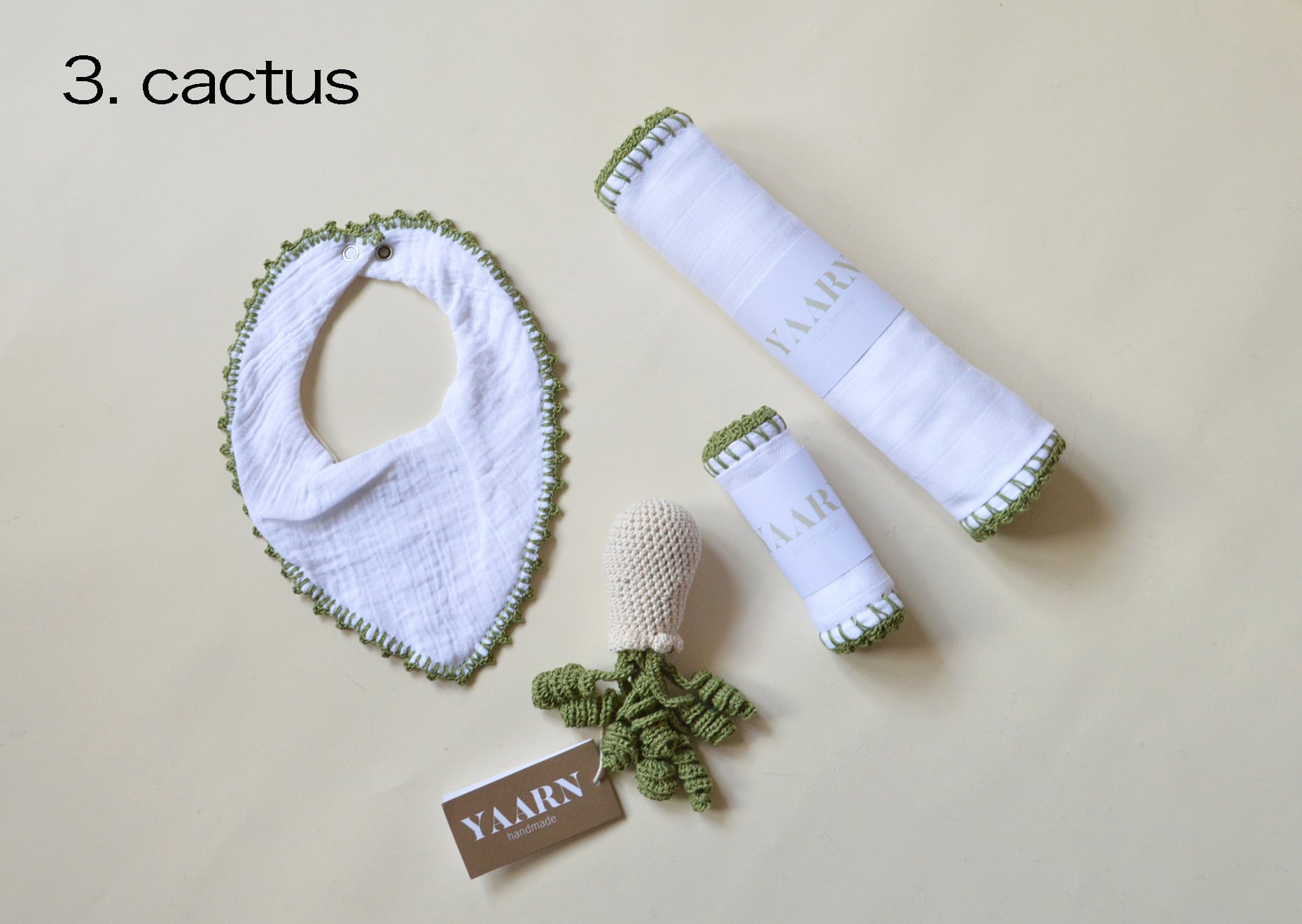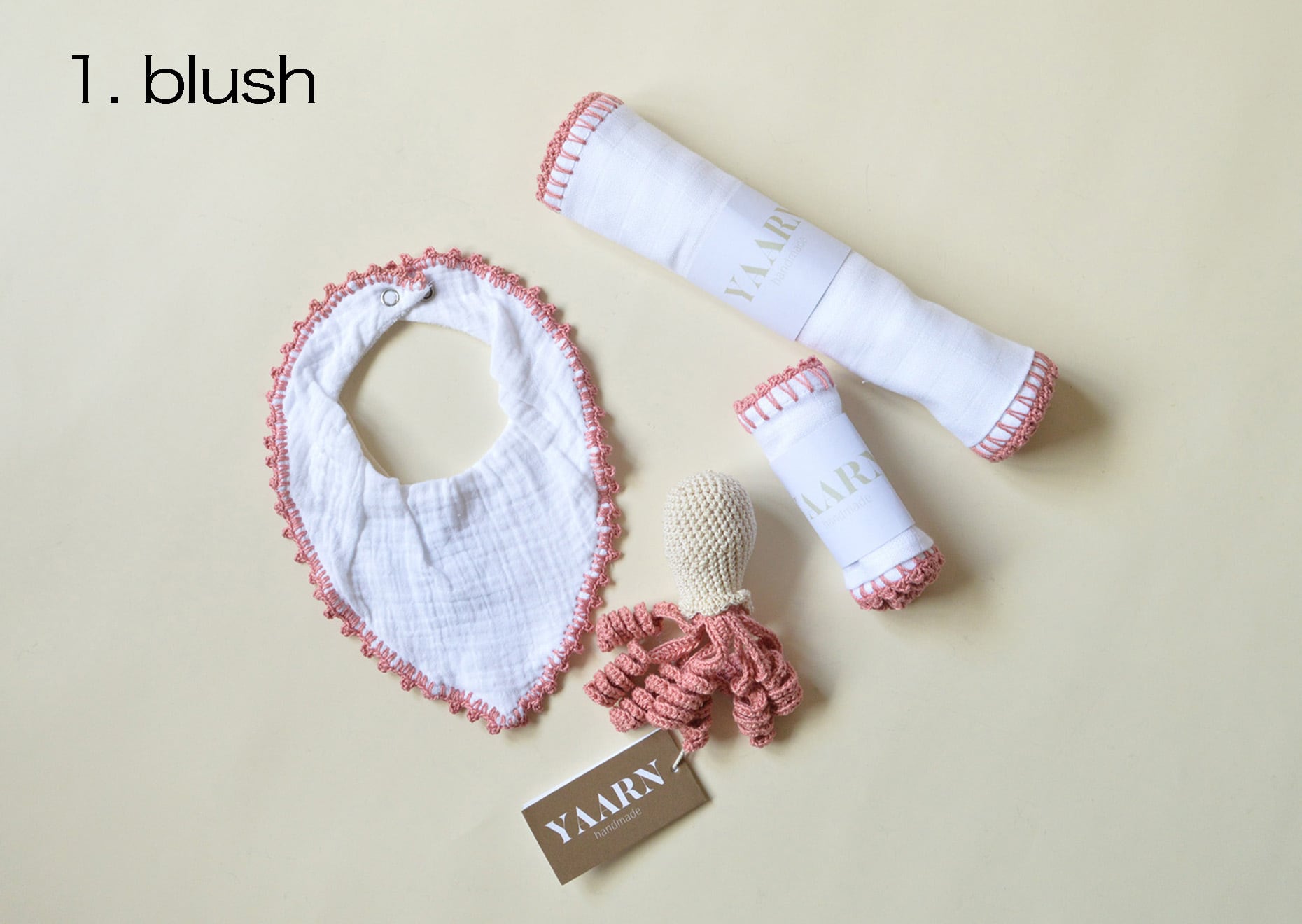 ・「1.blush」カラーにつきましては、ハンカチ、おくるみ、タコさんラトルは「dusty rose」をセット内容にしております。blushとdusty roseは実際ほとんどお色味が同じなので、このようなセット組みとしております。