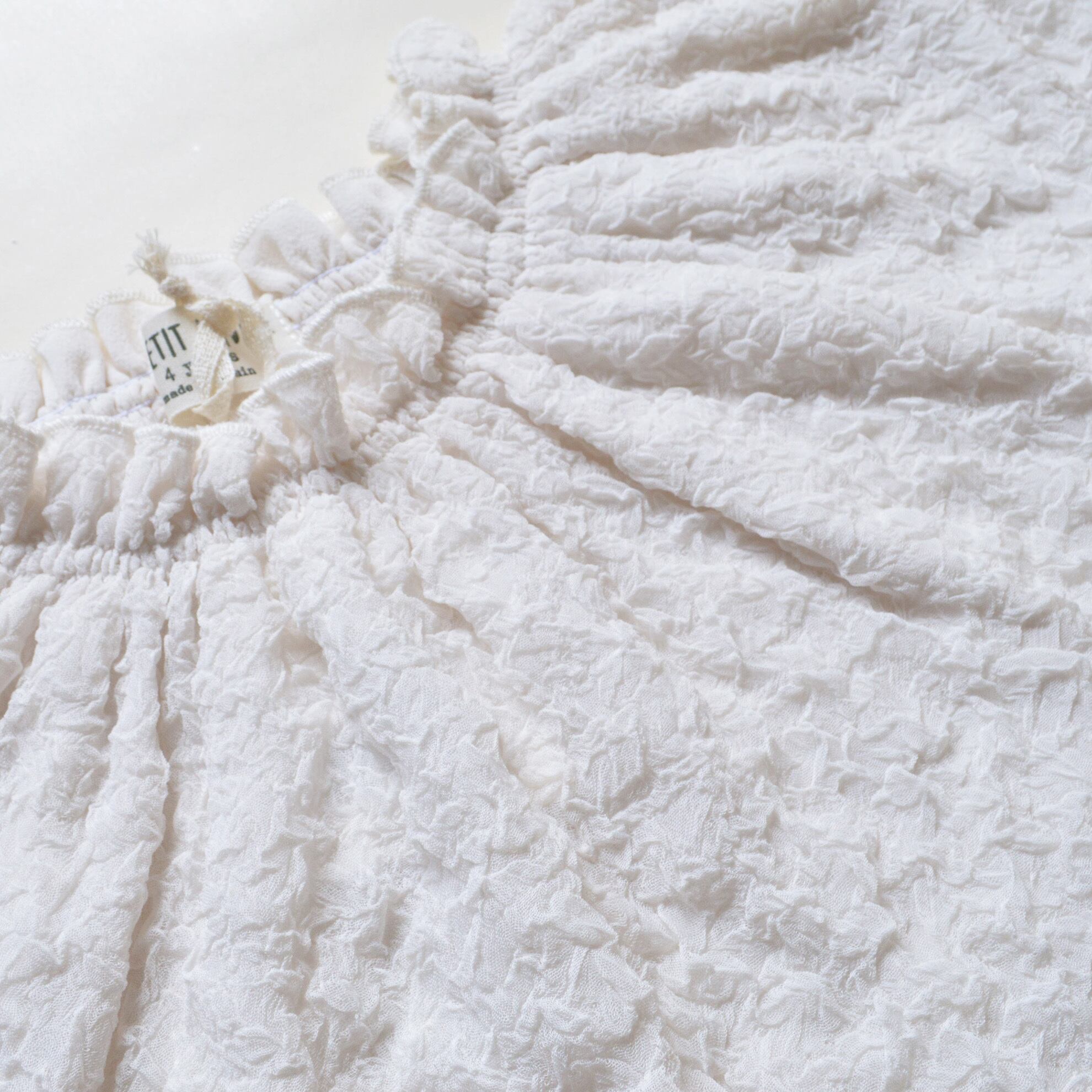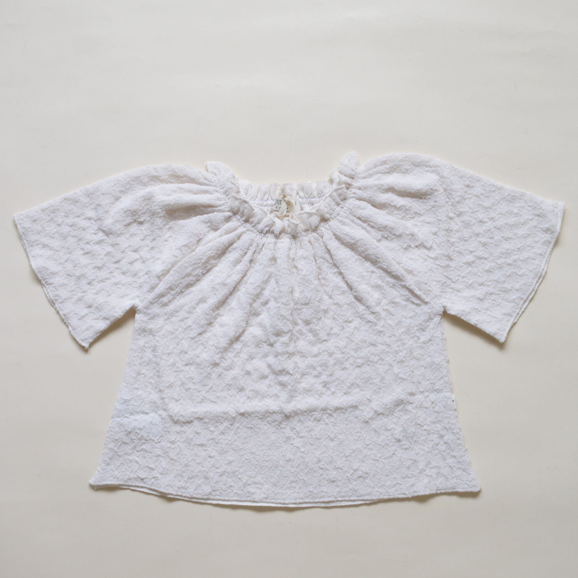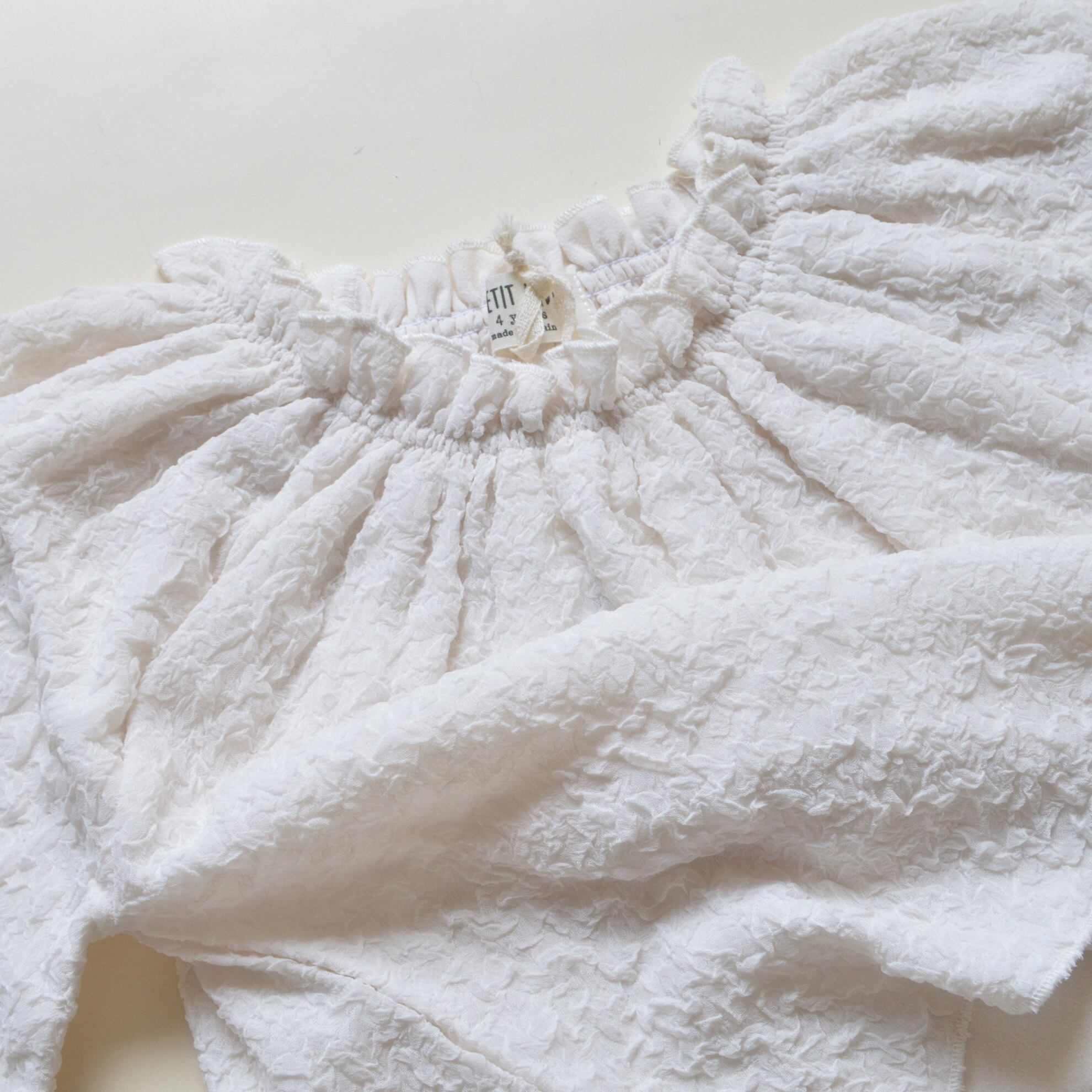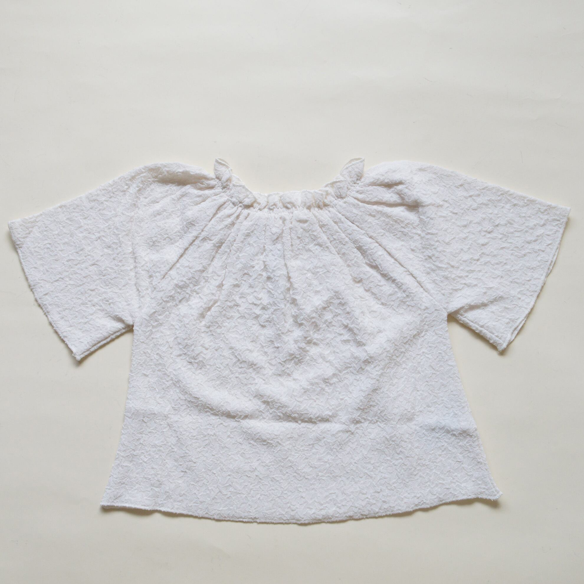 衿ぐりは大きく開くゴム仕様で、ふんわりしたシルエットが特徴のブラウス。