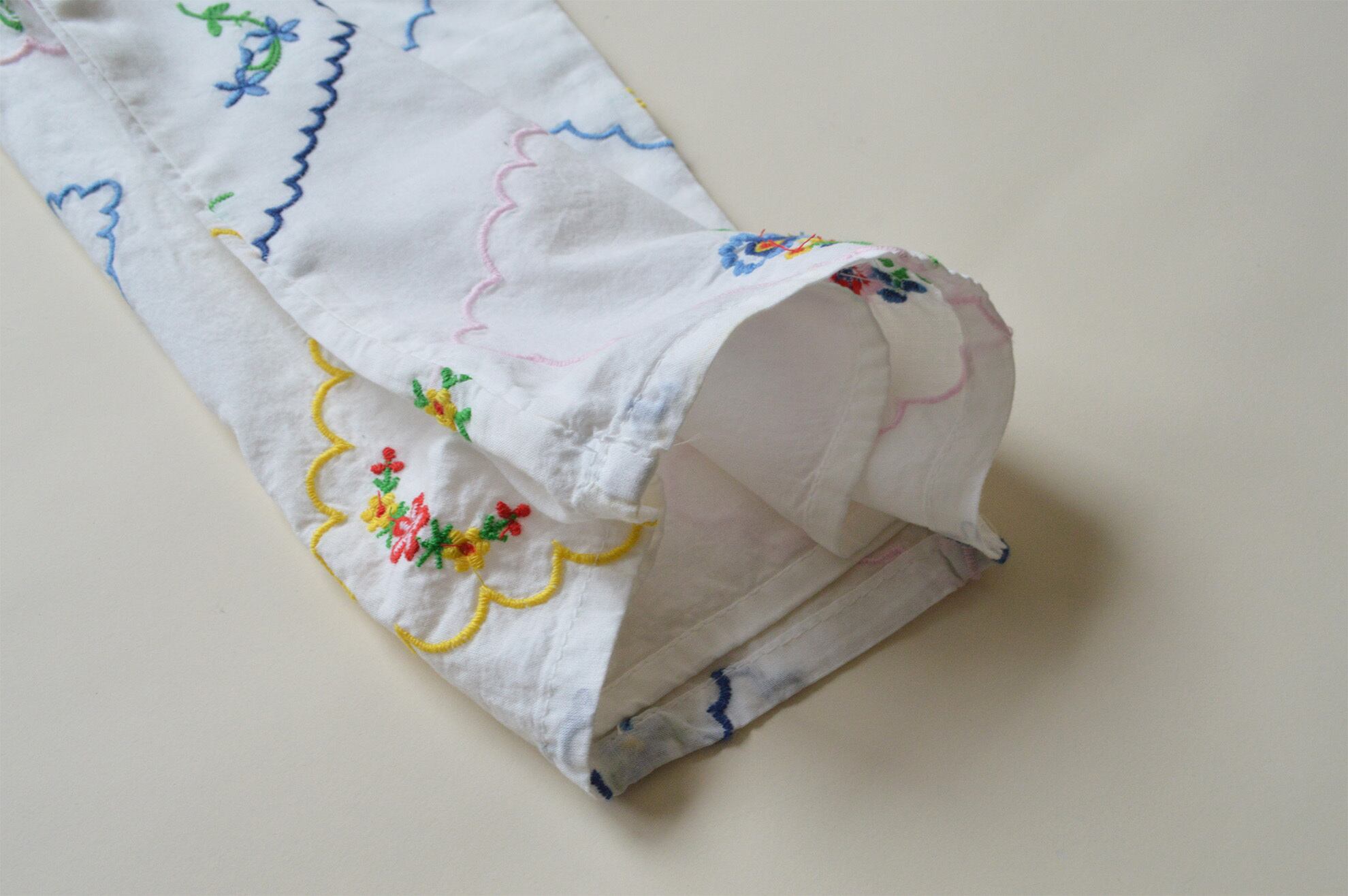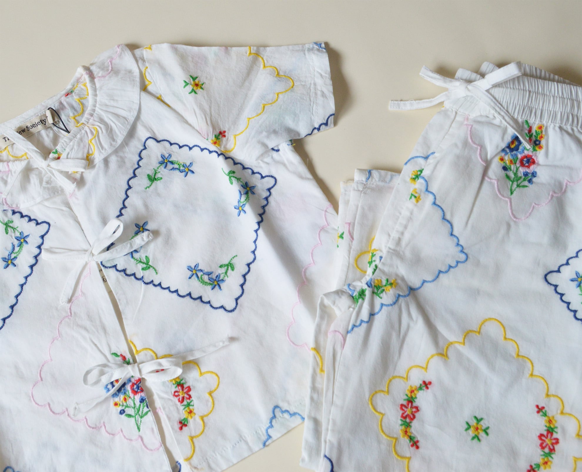 ヴィンテージのテーブルクロスやマルチカバーを思わせる刺繍生地が子供服に!