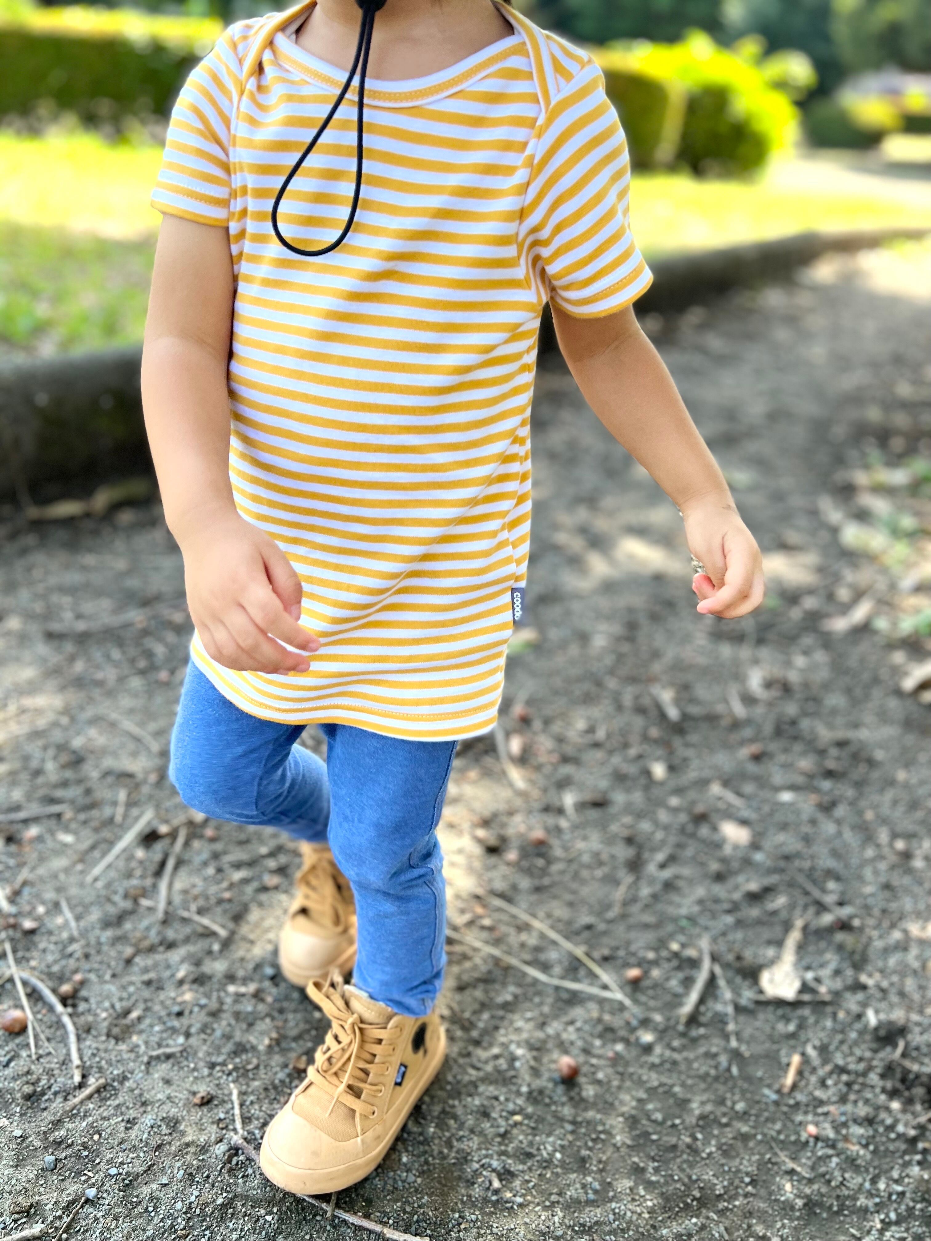 100%オーガニックコットンの布地が柔らかく、優しい着心地のTシャツです。キッズ服には珍しい襟ぐりが大きく開くデザインで、着脱時のストレスが少なく、首周りが大きすぎてTシャツの肩が落ちてしまうようなこともありません。