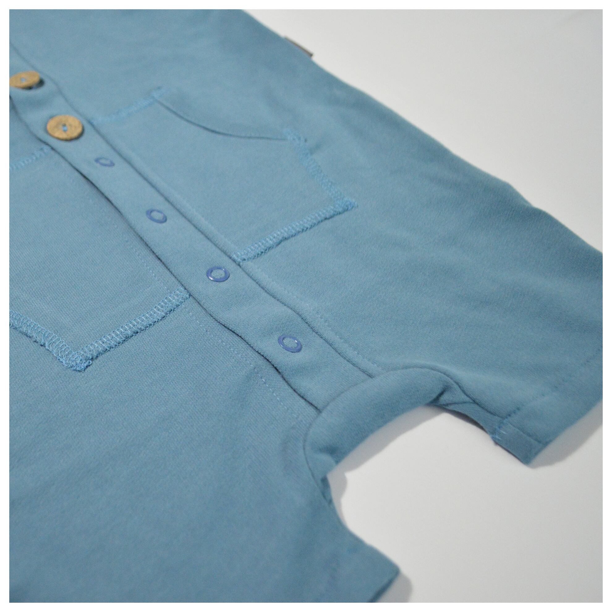 袖無しの大きめロンパース。上段は木製のボタン、下段(腰)はオムツ替えに便利なスナップボタンを使用しています。