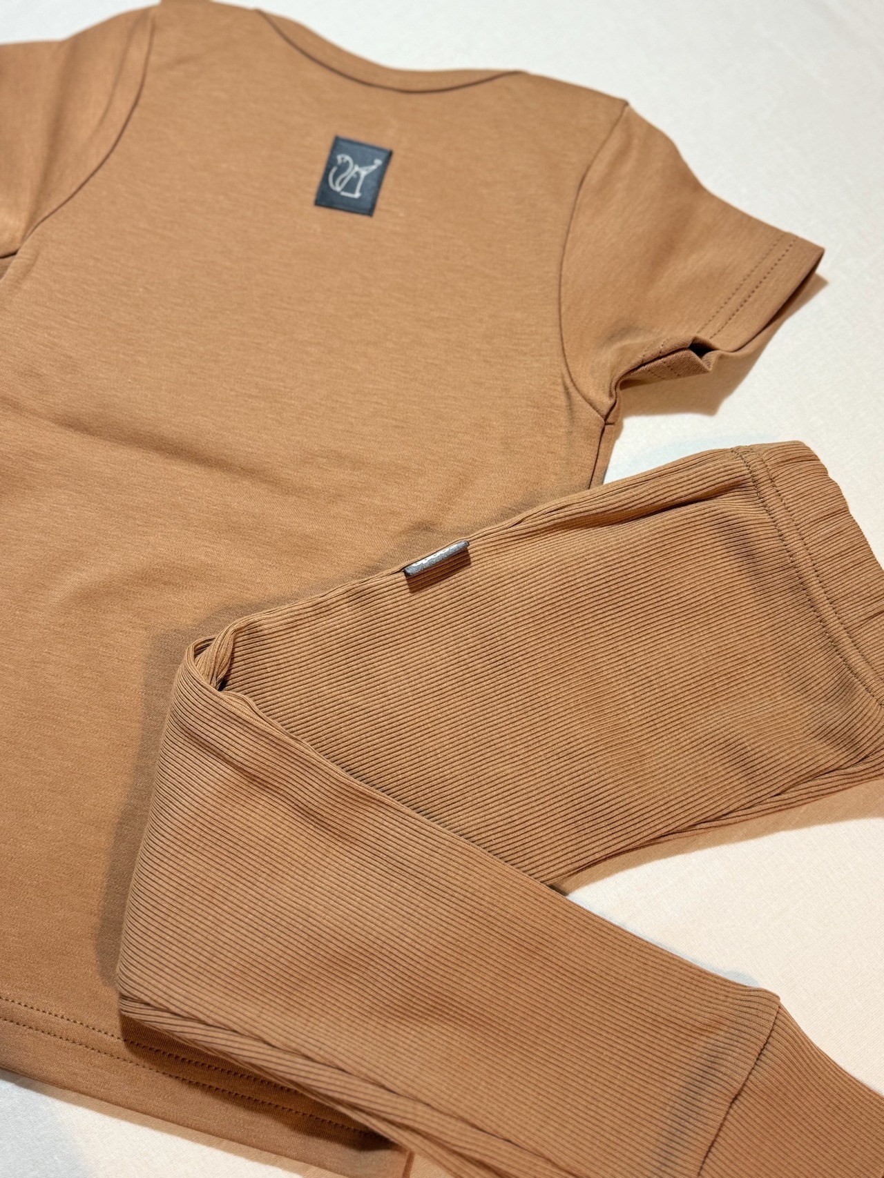 100%オーガニックコットンの半袖Tシャツとリブレギンスのセット。